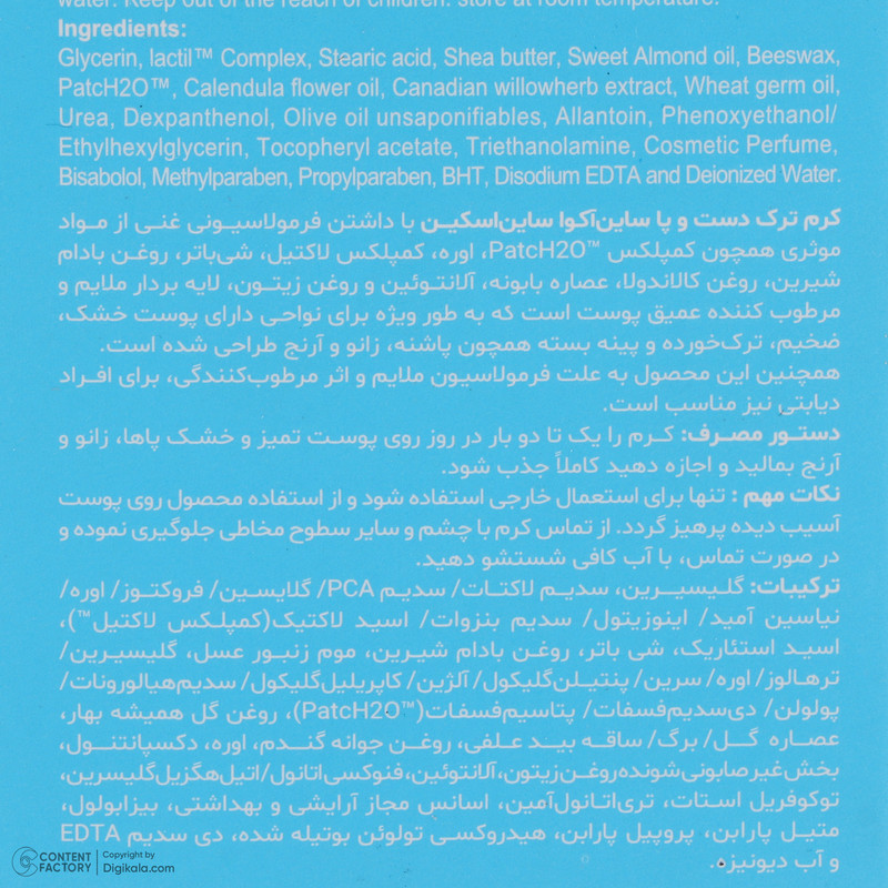 کرم ترک دست و پا ساین آکوا ساین اسکین یک محصول تخصصی برای درمان و پیشگیری از ترکهای دست و پا است. این کرم با ترکیبات موثری همچون کمپلکس Patch۲۰، اوره، کمپلکس لاکتیل، شی باتر، روغن بادام شیرین، روغن کالاندولا، عصاره بابونه، آلانتوئین و روغن زیتون، لایه بردار ملایم و مرطوب کننده عمیق پوست است که به طور ویژه برای نواحی دارای پوست خشک، ضخیم، ترک خورده و پینه بسته همچون پاشنه، زانو و آرنج طراحی شده است. همچنین به علت فرمولاسیون ملایم و اثر مرطوب کنندگی، برای افراد دیابتی نیز مناسب است.
