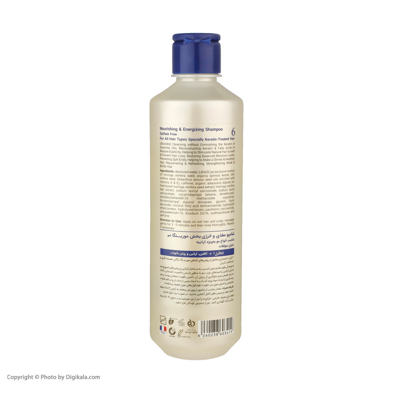 شامپو بدون سولفات مورینگا اِمو مدل 6، با حجم 400 میلیلیتر، یک گزینه عالی برای مراقبت از موهای شماست. این شامپو با فرمولاسیون خاص خود، شامل عصاره لافااُیل که ترکیبی از روغنهای گیاهی مورینگا، آرگان، هسته انگور و دانه آفتابگردان است، به تقویت و ترمیم موها کمک میکند. همچنین، ویتامینهای A و E موجود در این محصول، به حفظ رطوبت و سلامت موها یاری میرسانند. این شامپو بهطور خاص برای انواع مو طراحی شده و مناسب برای بانوان و آقایان است. ویژگیهای منحصر به فرد آن شامل تقویتکننده و ترمیمکننده موها، جلوگیری از ریزش و ایجاد موخوره، و همچنین محافظت از موها در برابر آسیبهای ناشی از نور خورشید و آلودگیهای محیطی میباشد. با استفاده از این شامپو، میتوانید از شستشوی مؤثر و در عین حال ملایم موها بهرهمند شوید. حجم این محصول 400 میلی لیتر است و برای استفاده طولانی مدت نیاز شما را برطرف خواهد کرد. استفاده از این محصول بسیار ساده است؛ کافیست مقدار مناسبی از شامپو را روی پوست سر خود به آرامی ماساژ دهید و پس از 3 تا 5 دقیقه، بهطور کامل آبکشی کنید. در صورت نیاز، میتوانید این فرآیند را تکرار کنید. این شامپو بهویژه برای افرادی که بوتاکس، اکستنشن یا ریباند مو انجام دادهاند و همچنین کسانی که دچار خشکی پوست سر و اگزما هستند، مناسب است. شامپو مورینگا اِمو با مجوز از سازمان غذا و دارو، یک گزینه مطمئن و مؤثر برای مراقبت روزانه از موهای شماست. با انتخاب این محصول، میتوانید به موهای خود زندگی و شادابی ببخشید و از زیبایی طبیعی آنها لذت ببرید.