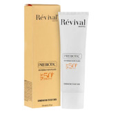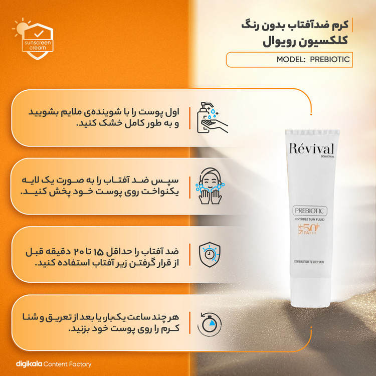کرم ضد آفتاب بی‌رنگ کلکسیون رویوال، spf 50، مدل prebiotic، ‌مناسب پوست‌های چرب و مختلط با حجم 50 میلی‌لیتر، محافظت‌کننده در برابر اشعه‌های UVA و PA ،UVB+++، ضد جوش و آکنه، دارای فرمولاسیون آنتی اکسیدان، نیاسینامید و ویتامین E، با ماندگاری 5 ساعته