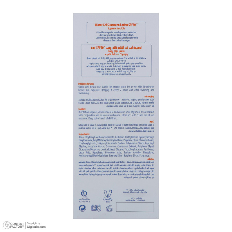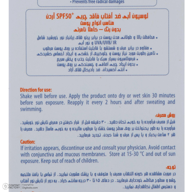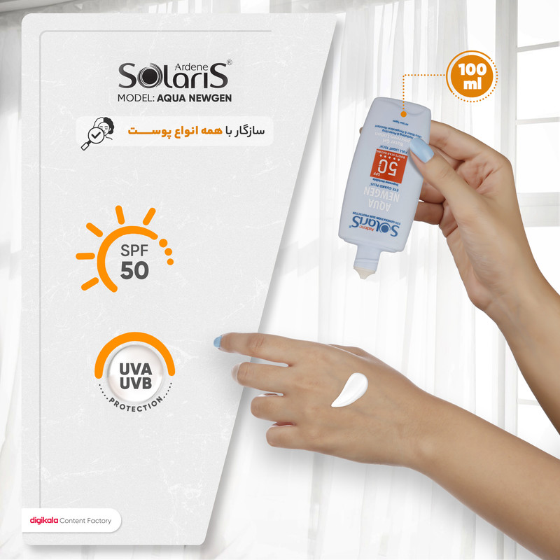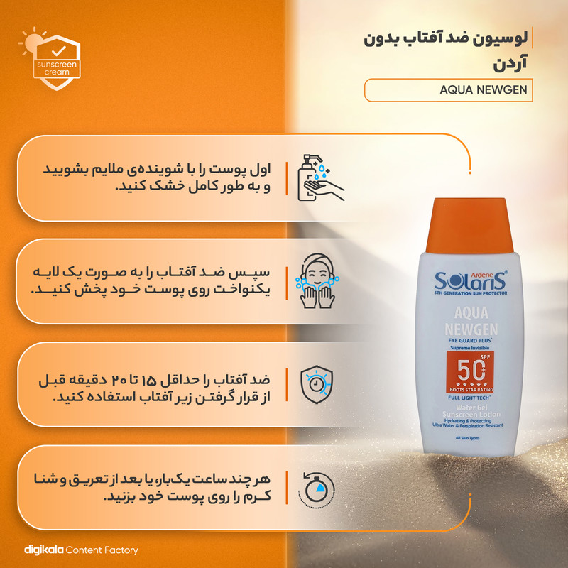 با ماندگاری دو ساعته و ویژگی ضد آب، لوسیون آردن سولاریس انتخابی ایدهآل برای استفاده در شرایط مختلف آب و هوایی است. این محصول با حجم 100 میلیلیتر، مناسب برای استفاده روی صورت، گردن و بدن بوده و به دلیل بافت بدون رنگ و فاقد چربی، برای همه انواع پوست قابل استفاده است. لوسیون آردن سولاریس با ترکیباتی که فاقد مواد مضر هستند، به حفظ سلامتی و زیبایی پوست شما کمک میکند. با انتخاب لوسیون ضدآفتاب آردن سولاریس، نه تنها از پوست خود در برابر اشعههای مضر محافظت میکنید، بلکه به حفظ محیط زیست نیز کمک میکنید. همین حالا این لوسیون را امتحان کنید و از تجربهای مطمئن و سازگار با طبیعت لذت ببرید.